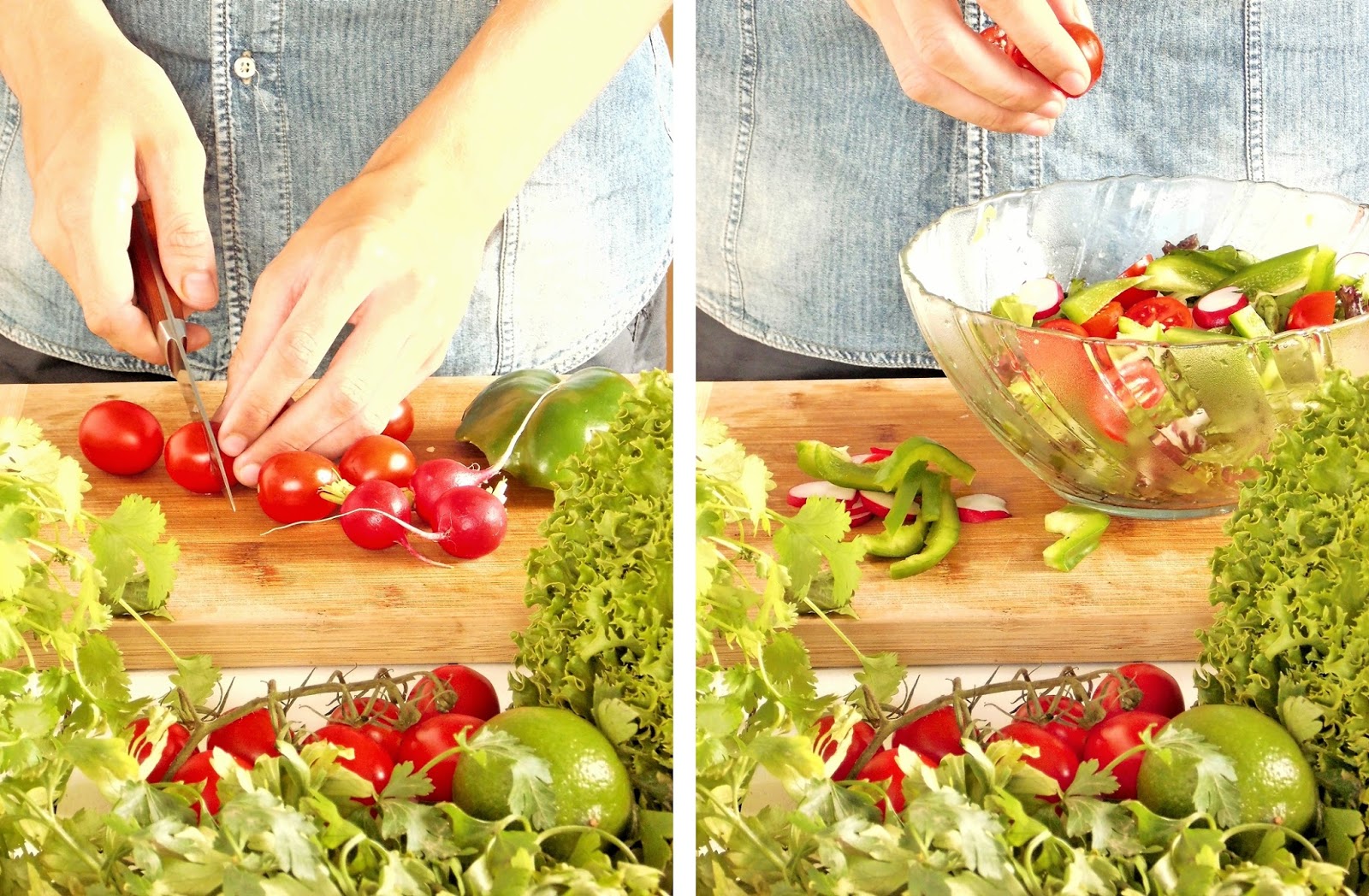 Pomidorki, rzodkiewkę i paprykę kroję. Dodaję do miski z umytą i osuszoną sałatą.