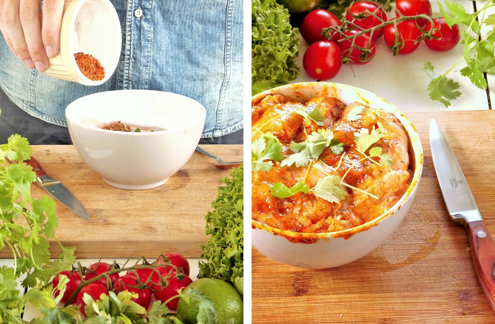 Wszystkie przyprawy łączę w miseczce, dodaję do kurczaka, mieszam. Odkładam do lodówki na minimum 40 minut.