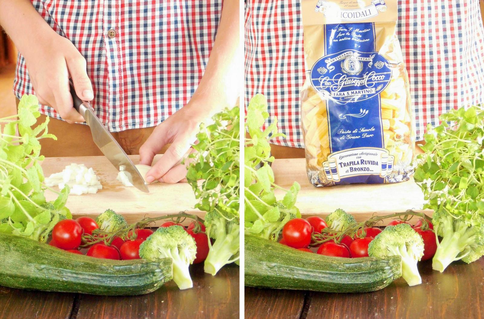 Cebulę z przeciśniętym czosnkiem podsmażam na łyżce oliwy przez 5 minut. Następnie dorzucam cukinię, brokuła i fasolkę szparagową. Smażę przez kilka minut, następnie dorzucam makaron, dolewam śmietankę i starty parmezan. Redukuję sos śmietanowy. Doprawiam solą, pieprzem i oregano. Pod koniec dorzucam garść rukoli. Mieszam i serwuję.
